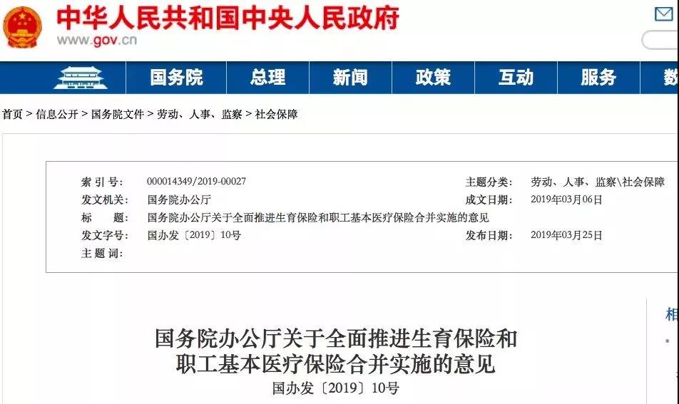 3月25日,国务院办公厅发布了《国务院办公厅关于全面推进生育保险和职工基本医疗保险合并实施的意见》(以下简称《意见》)。《意见》明确,生育保险基金并入职工基本医疗保险基金,统一征缴,统筹层次一致,而且合并要在2019年底前实施。