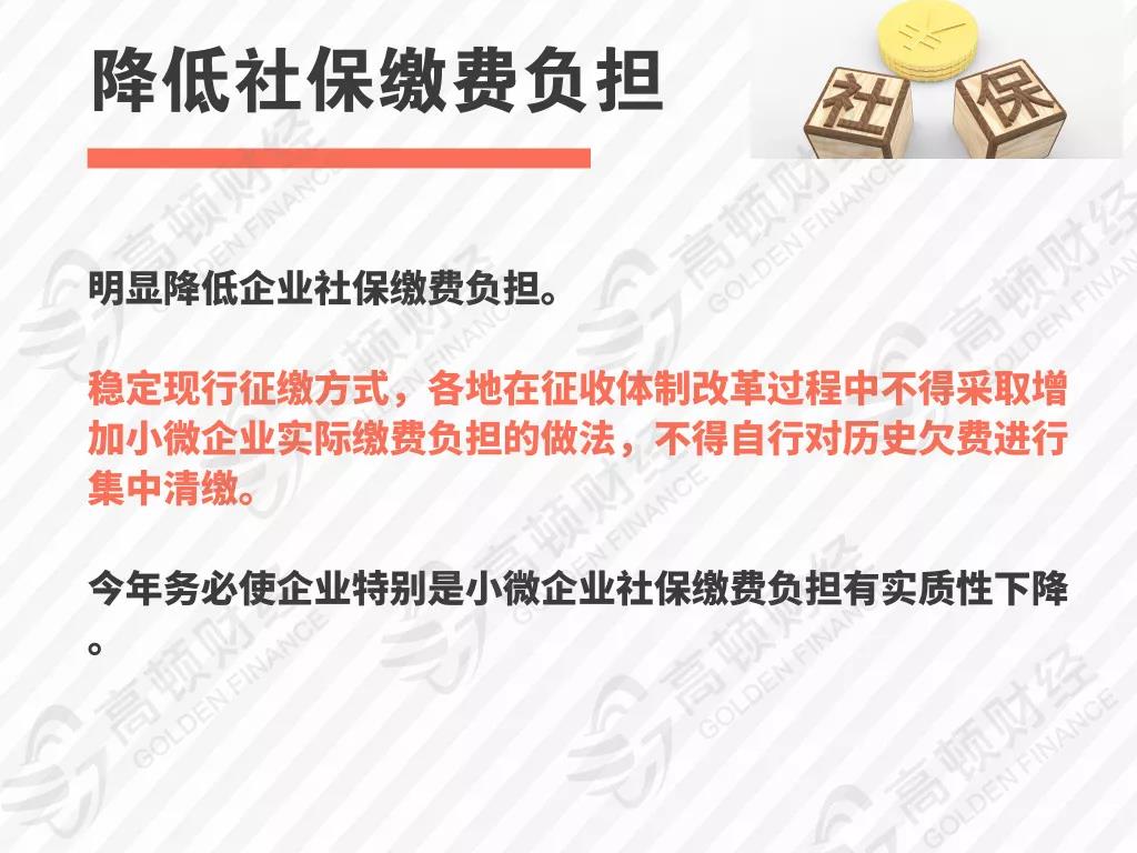 今年务必使企业特别是小微企业社保缴费负担有实质性下降。加快推进养老保险省级统筹改革,继续提高企业职工基本养老保险基金中央调剂比例、划转部分国有资本充实社保基金。我们既要减轻企业缴费负担,又要保障职工社保待遇不变、养老金合理增长并按时足额发放,使社保基金可持续、企业与职工同受益。